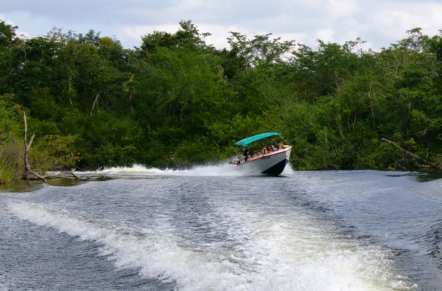 We were going into the turn a lot faster than I was expecting, but our guide appeared comfortable negotiating the river with his powerboat. Todays adventure was a river and lagoon boat ride to the Mayan ruins of Lamanai.